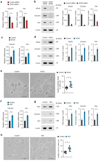 Next, we investigated whether NOX2-dependent high glycolytic activity could affect the gain of the COL5A1-mediated mesenchymal phenotype in human glioma cells. First, we analyzed the effects of NOX2 knockdown on the change of COL5A1 gene expression in U87MG glioma cells. NOX2 knockdown by NOX2 siRNA suppressed the levels of COL5A1 gene expression compared to that in control (Figure 5a). In addition, the levels of FN1 expression were reduced by NOX2 knockdown (Figure 5a). Similary, NOX2 knockdown suppressed the protein levels of COL5A1 and FN1 relative to that in control (Figure 5b). Moreover, the over-expression of HK2 significantly increased the gene and protein levels of COL5A1 and FN1 compared to that in control (Figure 5c,d). Consistently, the over-expression of NOX2 induced the morphological features of mesenchymal cells, including spindle-shape and large flattened-shape relative to that in control (Figure 5e). The length of the spindle-shape in cells was increased by NOX2 over-expression compared to that in control (Figure 5e). Similar with NOX2, the over-expression of HK2 increased the gene and protein levels of COL5A1 and FN1 compared to that in the control (Figure 5f,g). The over-expression of HK2 induced the morphological features of mesenchymal cells, including spindle-shape and large flattened-shape relative to that in the control (Figure 5h). These results suggest that NOX2 and HK2 induce COL5A1-mediated mesenchymal phenotype in human glioma cells.