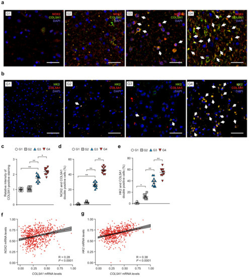 Next, we investigated whether NOX2 could affect the gain of COL5A1-mediated mesenchymal phenotype in GBM. First, we identified the levels of mesenchymal phenotype by gene expression profile using Nanostring analysis in glioma tissues of patients with GBM (Figure S6). The levels of mesenchymal subtype signature genes were elevated in glioma tissues of patients with GBM (G4) relative to that in patients with G2 and G3 gliomas (G2, G3) (Figure S6). Next, we analyzed the expression levels of COL5A1 in NOX2-positive cells of glioma tissues from patients with GBM (Figures 6a and S7). The intensity of COL5A1-positive staining was increased in patients with GBM (G4) and G3 glioma (G3) compared to that in patients with G1 and G2 gliomas (G1, G2) (Figure 6b). The number of cells showing subcellular co-localization of COL5A1 and NOX2 was significantly increased in patients with GBM (G4) and G3 glioma (G3) compared to that in G1 and G2 glioma (Figure 6c). Similarly, the number of cells showing subcellular co-localization of COL5A1 and HK2 was increased in patients with GBM (G4) and G3 glioma compared to that in G1 and G2 glioma (Figures 6d and S8). Notably, the intensity of COL5A1-positive staining and the number of cells showing subcellular co-localization of COL5A1 and NOX2 or HK2 were significantly elevated in in patients with GBM (G4) relative to that in patients with G3 glioma (G3) (Figure 6c–e). Furthermore, the expression of the COL5A1 gene was positively correlated with the expression of the NOX2 and HK2 genes in the analysis of the GBM and LGG datasets from TCGA (Figure 6f,g) and REMBRANDT (Figure S9). These results suggest that NOX2 and HK2 contribute to the gain of the COL5A1-mediated mesenchymal phenotype in patients with GBM.
