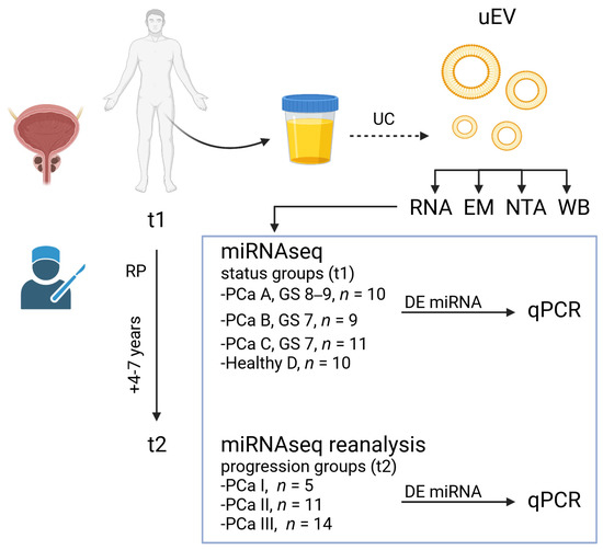 Outline of the main study. Study outline shows urine sample collection from prostate cancer (PCa) patients (time 1, t1) before radical prostatectomy (RP) and subsequent urinary extracellular vesicle (uEV) isolation with ultracentrifugation (UC) and miRNA sequencing (miRNAseq). The uEV quality control was carried out via RNA profiling, electron microscopy (EM), nanoparticle tracking analysis (NTA) and Western blotting (WB). After miRNAseq, differentially expressed (DE) miRNAs were compared between PCa status groups (A–C) and healthy technical controls (D). Groups A–C were based on Gleason scores (GS) 7–9, determined in prostatectomy tissue and other findings. Group B differed from C by more severe histological findings, metastasis or higher prostate specific antigen levels post-RP. Cancer progression was followed for 4–7 years post-RP and then (t2) patients were reclassified to groups (I–III) according to disease aggressiveness for reanalysis of the miRNAseq data. Groups I–III were based on death due to prostate cancer, metastasis or hormonal treatment (I), secondary treatment or biochemical recurrence (II) or no events (III) during follow-up time. Selected DE miRNAs from both analyses were confirmed by quantitative PCR (qPCR). Created with BioRender.com.