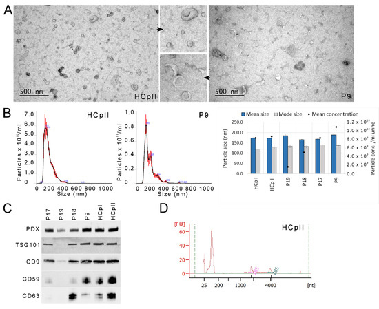 Quality control of uEV. (A) Representative electron micrographs (wide-field and close-up) and (B) representative nanoparticle tracking analysis histograms, as well as mean and mode size and mean concentration of particles in different study samples. (C) Same samples were subjected to analysis of uEV enriched protein markers by Western blotting. The uncropped Western blots have been shown in Figure S5. (D) Total RNA profile from HCpII uEV obtained by Bioanalyzer Pico assay. The status and progression groups of the patients were: P9—B and I, P17—C and II, P18—C and II, P19—C and III. Concentration (Conc.), healthy control pool I and II (HCpI and HCpII), patient (P), podocalyxin (PDX).
