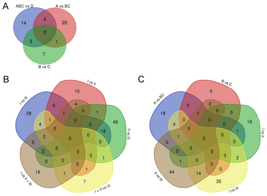 Venn analysis of differentially expressed miRNAs from miRNAseq. Comparison of changed miRNAs between (A) prostate cancer status groups (A–C) or healthy group (D) and (B) prostate cancer progression groups (I–III) and (C) both status and progressions groups.
