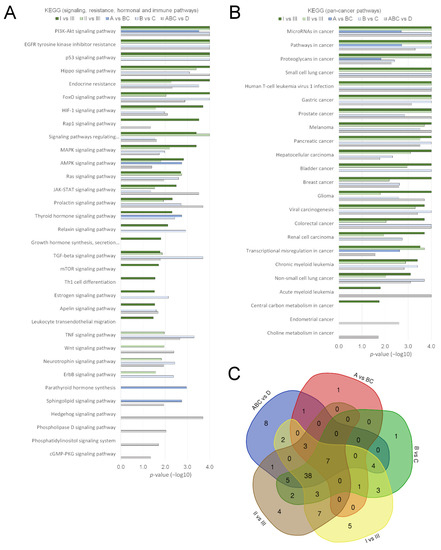 KEGG pathway analysis for differentially expressed miRNAs. The figure shows significant KEGG pathways for mRNAs targeted by the differential miRNAs from miRNAseq. (A) KEGG signalling, resistance, hormonal and immune pathways and (B) Pan-cancer associated pathways for comparison of prostate cancer (PCa) status and progression groups (A–C, I–III, n = 30 patients) and the healthy group (D, n = 10). (C) Venn diagram of all significant pathways for the comparisons. Differential miRNAs with FDR p or p < 0.05 were included in the analysis (Tables S5 and S10). Pathway p-values are shown in −log10 scale.
