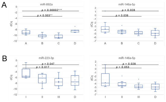 Confirmation of differentially expressed miRNAs by qPCR. Figure depicts expression of the miRNAs with the most significant changes between (A) PCa status groups (A–C) or (B) PCa progression groups (I–III). For clarity, only ANOVA p-values are shown with and without the healthy (D) group (for individual comparisons, see Table 2). Box-and-whiskers plots present the first quartile, median and third quartile, minimum and maximum values and outliers that are marked outside the whiskers range. Stars after p-values indicate the false discovery rate (FDR p-value ** < 0.01, *** < 0.001). Delta quantification cycle (dCq).