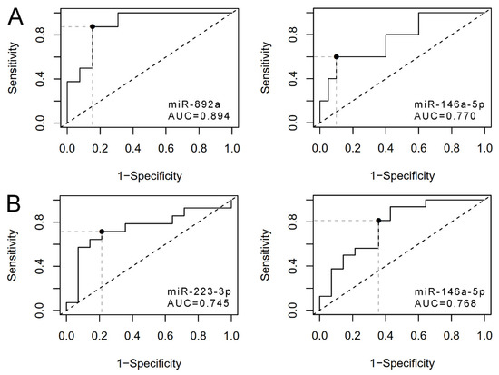 ROC curves. Receiver operator characteristic (ROC) curve analysis using qPCR data of the key differentially expressed miRNAs: (A) miR-892a and miR-146a-5p for separating Gleason score ≥ 8 (Group A) from the Gleason score 7 (B and C combined), as well as (B) miR-223-3p and miR-146a-5p for separating progressors (Groups I and II combined) from non-progressors (Group III). Area under the curve (AUC).