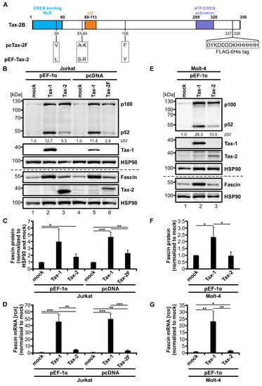 To further consolidate results, we additionally performed transient transfection of Molt-4, another CD4+ T-cell line, with pEF-1α expression vectors for Tax-1 and Tax-2B (Figure 1E–G). The basal activity of the classical and alternative NF-κB signaling pathway was comparable between mock-transfected Molt-4 T-cells (Figure 1E) and mock-transfected Jurkat T-cells (Figure 1B), resulting in comparable levels of p100 and p52 protein, respectively. Confirming data from Jurkat T-cells, both Tax-1 and Tax-2 enhanced p100 expression similarly, resembling classical NF-κB signaling. They both induced processing of p100 to p52; however, Tax-1 was more potent than Tax-2 in increasing alternative NF-κB signaling in Molt-4 T-cells (pEF-Tax-1: 26.3-fold; pEF-Tax-2: 10.5-fold induction of p52 protein compared to mock). Quantification of Fascin protein (Figure 1F, p < 0.05) and Fascin transcript (Figure 1G, p < 0.01) expression revealed that Tax-1 is also a potent, significant inducer of Fascin in Molt-4 T-cells, although the enhancement was lower than observed in Jurkat T-cells (Figure 1C,D). Tax-2 was able to slightly but significantly increase Fascin transcripts in Molt-4 T-cells (Figure 1G, p < 0.05); however, different than in Jurkat T-cells (Figure 1B,C), Tax-2 did not lead to the induction of Fascin protein expression in Molt-4 cells (Figure 1E,F). In conclusion, Tax-2 is a potent inducer of Fascin expression independent of the promoter used but with varying effects in different T-cell lines. Together, these data make comparisons between Tax-1 and Tax-2 valuable tools to study transcriptional regulation of viral target genes in T-cells.