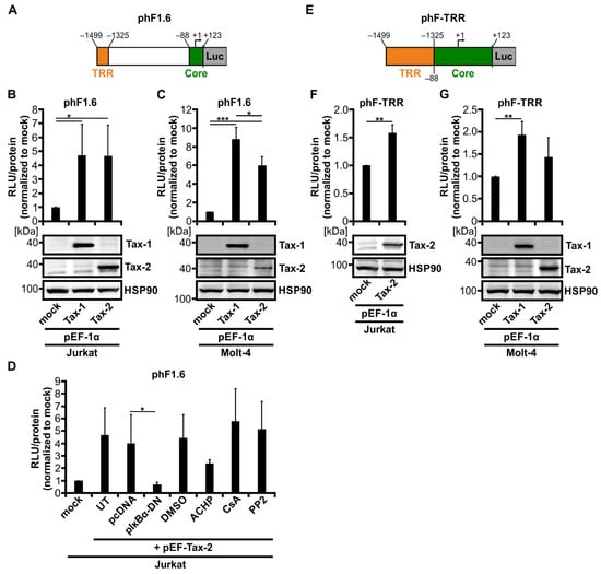 Tax-2 and Tax-1 activate a 1.6 kb fragment of the human Fascin promoter at comparable levels. (A) Schematic representation of the luciferase (Luc) reporter construct phF1.6 carrying the 1.6 kb fragment of the human Fascin promoter. The positions of the Tax-responsive region (TRR) and of a core promoter fragment (Core) are indicated. Numbers show distances from the transcription start point (+1) of the full-length human Fascin promoter. (B,D) Jurkat or (C) Molt-4 T-cells were co-transfected with phF1.6. After 48 h, luciferase activity was measured (RLU, relative light units) followed by normalization on total protein content and on mock-transfected samples (pEF-1α). The mean values of three independent experiments ± SD are shown and were compared using Student’s t test (* p < 0.05, *** p < 0.001). (B,C) Cells were co-transfected with phF1.6 (20 µg), pEF-Tax-1 (Tax-1), pEF-Tax-2 (Tax-2), or the mock control vector pEF-1α (30 µg each). Immunoblots of Tax-1, Tax-2, and the housekeeping gene heat shock protein 90 (HSP90) are shown. (D) Cells were co-transfected with phF1.6 (20 µg) and expression plasmids pEF-Tax-2 (Tax-2) (20 µg) and pIκBα-DN (10 µg), or the respective control vectors pEF-1α or pcDNA. After co-transfection with pEF-Tax-2, cells were treated with 10 µM ACHP, 1 µg/mL cyclosporine A (CsA), 5 µM PP2, or the solvent control dimethyl sulfoxide (DMSO) for 48 h, or were left untreated (UT). (E) Schematic representation of the Luc reporter construct phF-TRR carrying the TRR of the human Fascin promoter inserted upstream of the Fascin core promoter. Numbers show distances from the transcription start point (+1) of the full-length human Fascin promoter. (F) Jurkat or (G) Molt-4 T-cells were co-transfected with phF-TRR (20 µg), pEF-Tax-1 (Tax-1), pEF-Tax-2 (Tax-2), or the mock control vector pEF-1α (30 µg each) as indicated. After 48 h, luciferase activity was measured (RLU) and normalized to total protein content and to mock-transfected samples (pEF-1α). Mean values of three independent experiments ± SD are shown and were compared using Student’s t test (** p < 0.01). Immunoblots of Tax-1, Tax-2, and HSP90 are depicted.