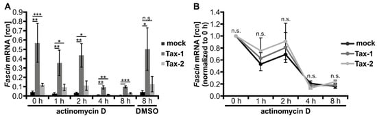 Tax-1 and Tax-2 do not stabilize Fascin transcripts. (A,B) Jurkat T-cells were transfected with expression plasmids pEF-Tax-1 (Tax-1), pEF-Tax-2 (Tax-2), or the mock control vector pEF-1α (100 µg each). After 24 h, cells were treated with 5 µg/mL actinomycin D for a time course of 0, 1, 2, 4, and 8 h. Fascin transcript levels were measured by quantitative PCR (qPCR) and normalized to β-actin, resulting in relative copy number (rcn) of Fascin transcripts. The means of three independent experiments ± SD are shown. (A) Cells treated with dimethyl sulfoxide (DMSO) for 8 h served as solvent control. Values were compared using Student’s t test (* p < 0.05, ** p < 0.01, *** p < 0.001, n.s., not significant). (B) Rcn were normalized to the respective time point t = 0 h of actinomycin D treatment, and two-way ANOVA was performed (n.s., not significant).