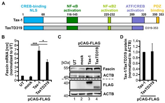 To further uncover the differences between Tax-1 and Tax-2 that account for the heterogeneity in transcriptional regulation of Fascin, we tested whether a crucial domain that is present in Tax-1 but not in Tax-2 may account for the observed phenotypes: the PBM. While Tax-1 harbors a C-terminal PBM (Figure 4A; aa 350-353; ETEV), this motif is absent in Tax-2 (Figure 1A). Briefly, the PBM has been shown to interact with proteins containing a PDZ domain. In the context of Tax-1, this interaction is important for viral persistence and cell proliferation, thereby modulating T-cell transformation [21,23,25]. To check the hypothesis of whether the PBM of Tax-1 is also required for transcriptional induction of Fascin, Jurkat T-cells were transfected with plasmid TaxTD319 lacking aa 319-353 of Tax-1 including the PBM and were compared to cells transfected with wildtype Tax-1 (Tax wt), the mock vector (pCAG-FLAG), or untreated cells (UT). qPCR analysis (Figure 4B) revealed that TaxTD319 is still able to significantly enhance Fascin transcripts four-fold compared to mock (p < 0.001), but to a significantly lesser extent than wildtype Tax-1 (7-fold; p < 0.05). Induction of Fascin expression could be further confirmed by immunoblot (Figure 4C). Since TaxTD319 is still able to increase Fascin while being expressed at comparable levels such as Tax-1 wt (Figure 4D), the PBM of Tax-1 is dispensable for the regulation of Fascin; however, it contributes to full transcriptional induction of Fascin expression.