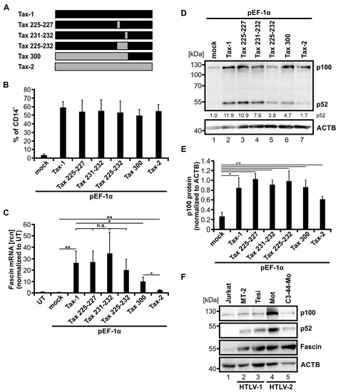 After identifying the varying potential of the Tax-1/Tax-2 chimeras to induce Fascin expression, we checked via immunoblot whether the proposed reduction of alternative NF-κB activation [26] could be confirmed and could be responsible for these differences (Figure 5D). As expected, Tax-1 induced the highest amount of p52 protein detected by densitometric analysis of the representative immunoblot (p52 protein normalized to mock; 11.9). The Tax-1/Tax-2 chimeras, however, displayed decreasing activity of alternative NF-κB signaling, whereby Tax 225-227 showed the highest amount of p52 (10.9), followed by Tax 231-232 (7.6), Tax 300 (4.7), and Tax 225-232 (3.8). This is in line with earlier studies showing that the Tax-1/Tax-2 chimera Tax 225-232 lacks a leucine zipper-like region crucial for activating the alternative NF-κB signaling pathway [26]. Once again, Tax-2 showed the lowest alternative NF-κB activity indicated by the lowest value of p52 protein expression (1.7). However, analysis of p100 expression revealed that all Tax constructs were able to significantly induce p100 expression compared to mock-transfected cells, and thus, classical NF-κB activity (Figure 5E; p < 0.05), confirming data obtained with the CD14 reporter (Figure 5B). In conclusion, we revealed a relation between alternative NF-κB signaling and Fascin expression: p100 processing to p52 is linked to transcriptional induction of Fascin.