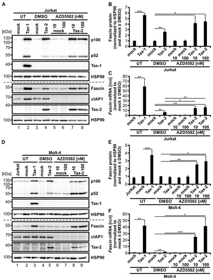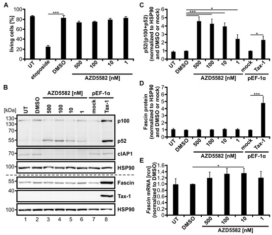 To further elucidate its role in the regulation of Fascin expression, we strived to activate the alternative NF-κB signaling pathway independent of Tax-1. Therefore, the mimetic of the second mitochondria-derived activator of caspases (SMAC) AZD5582 was used, which is known to activate alternative NF-κB signaling in T-cells [61]. Jurkat T-cells were treated with different amounts of AZD5582 for 48 h, which had no toxic effects independent of the concentration used. In contrast, the positive control etoposide, a topoisomerase II inhibitor, significantly reduced cell vitality (Figure 6A, p < 0.001). The functionality of AZD5582 was confirmed by degradation of cIAP1 as well as processing of p100 to p52 via immunoblot (Figure 6B). Further, the processing of p100 to p52 was evaluated via densitometric analysis (Figure 6C; p52/(p100 + p52)) and showed a dose-dependent significant activation of alternative NF-κB signaling for all concentrations of AZD5582 used. Jurkat T-cells transfected with Tax-1 expression plasmids served as a positive control and indicated that not only p100 expression but also its processing into p52 was highly induced. The p52 levels once more coincided with a significantly elevated amount of Fascin protein (Figure 6B,D, p < 0.001), as described previously (Figure 1). Nevertheless, treatment of AZD5582 and the resulting activation of the alternative NF-κB pathway was insufficient to amplify Fascin on protein level (Figure 6B,D). On transcript level, however, little induction of Fascin was observed that was significant for one concentration of AZD5582 (Figure 6E; 10 nM, p < 0.05), but which by far did not reach the Fascin transcript levels elicited by Tax-1 dependent NF-κB signaling as demonstrated earlier (Figure 1). In conclusion, activation of the alternative NF-κB signaling pathway by treatment of Jurkat T-cells with the SMAC-mimetic AZD5582 is not sufficient in inducing strong and robust Fascin expression.