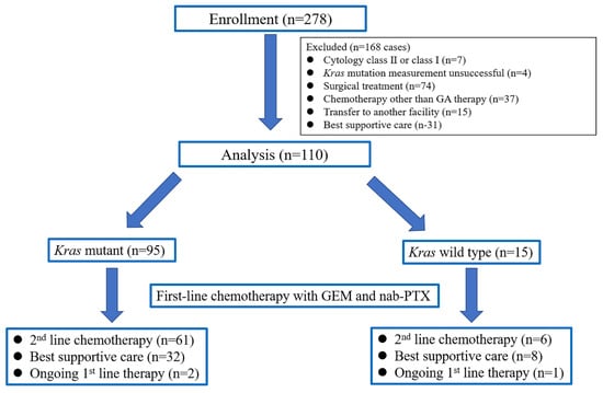 The primary endpoints were PFS and OS of patients with unresectable PDAC who underwent first-line GA chemotherapy. These endpoints were evaluated according to differences in the Kras mutation status in residual LBC specimens from EUS-FNA. The factors predictive of PFS and OS were also analyzed.