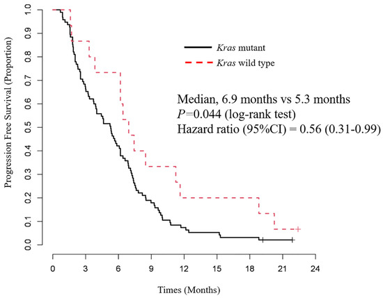 Progression–free survival according to Kras status after first–line chemotherapy with GEM and nab–PTX. The median PFS in the wild-type Kras and mutant Kras groups was 6.9 and 5.3 months, respectively. PFS in the wild-type Kras group was significantly longer than that in the mutant Kras group (p = 0.044).
