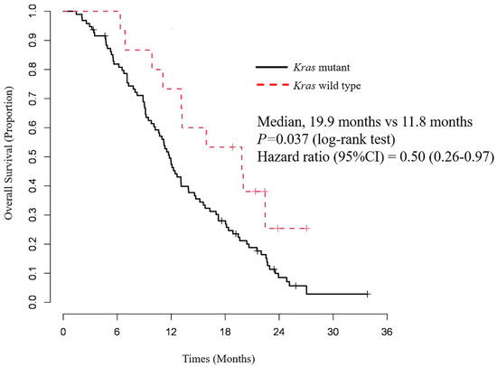 Overall survival according to Kras status after first–line chemotherapy with GEM and nab–PTX. The median OS in the wild-type Kras and the mutant Kras group was 19.9 and 11.8 months, respectively. OS was significantly longer in the wild-type Kras group than in the mutant Kras group (p = 0.037).