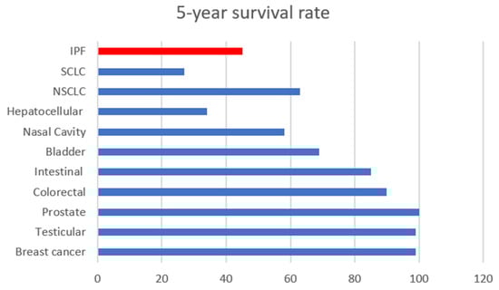 The 5-year survival percentage of idiopathic pulmonary fibrosis (IPF) relative to several types of cancers. The cancer 5-year survival data were retrieved from the American Cancer Society [37].
