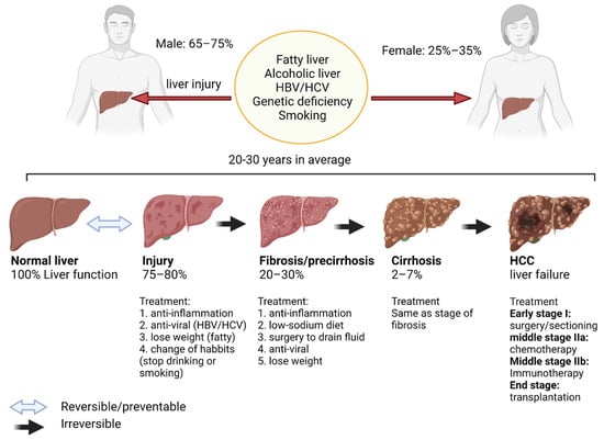 There are three stages of this disease: pre-cirrhotic disease, compensate cirrhosis and decompensated cirrhosis. In the pre-cirrhotic disease stage, major and continued inflammation and liver injury occur. Cytokine storms triggered by acute injuries, pathogens, cancers and autoimmune conditions cause the hyperactivation of immune cells. The prevention of further progression could be achieved with early treatments targeting the cause of injury. However, once the liver enters the next stage, fibrosis occurs to compensate cirrhosis and cannot be reversed. With the dysregulation in ECM production that is caused by pro-inflammatory intracellular signals, the accumulation of collagen, MMPs, α-SMA and fibronectin, liver functions are impaired. Treatments, including those with anti-fibrotic and anti-inflammation agents, can only delay further progression. During the decompensated stage, most liver functions, including detoxification and glucose metabolism, are significantly impacted due to fibrosis and necrosis. Patients with decompensated cirrhosis are considered for liver transplantation as no other curative therapy is available. Liver cancers such as hepatocellular carcinoma (HCC) may develop in up to 29.7% of cirrhotics patients within ten years [55]. Treatment options for HCC include radiotherapy, trans-arterial chemoembolization (TACE) and radiofrequency ablation (RFA). Other treatment options include immunotherapy with immune checkpoint inhibitors such as pembrolizumab. However, only 20% of patients respond to this therapy [56].