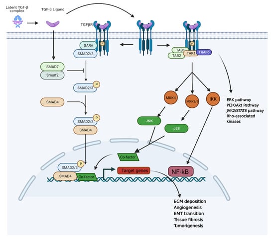 According to our current understanding, TGF-β plays the role of a double-edged sword in inflammation and cancer. In the case of common acute injury, TGF-β is an important anti-inflammatory cytokine that can protect tissue from injury. It also plays an essential role in tissue repair. However, TGF-β could also be a pro-inflammatory cytokine under the conditions of a chronic injury and a tumor microenvironment. The activation of TGF-β is usually caused by tissue inflammation, ROS upregulation and immune response. TGF-β has three isoforms, which are TGF-β1–3, among which TGF-β1 plays the critical role of inducing inflammation [102]. TGF-β is often secreted by cells in a large latent complex (LLC) in which the TGF-β is protected by the latency-associated peptide (LAP) and covalently bond to a family member of the “latent TGF-β-binding proteins” (LTBPs) [103,104]. Upon cleavage, the small latent complex (SLC) will be formed. However, TGF-β needs to be activated via the release of LAP. Only a few cell types can secret the SLC form of TGF-β. Additionally, the SLC form can be activated by non-integrin activation [104], including low pH (pH < 4) [105], protease activity (MMPs) [106], ROS [107] and thrombospondin-1 [108] (TSP-1)-induced LAP transformation. Integrins αvβ6 and αvβ8 play roles in TGF-β activation via different mechanisms. Specifically, the LLC form of TGF-β binds to αvβ6 or αvβ8 of the other cell on the membrane. For αvβ6, cell traction and pulling induce conformational change in LAP to release TGF-β in its active form. Integrin αvβ8 induces MT-1 MMP into the LAP interaction, and therefore a proteolytic cleavage between LAP and TGF-β [109]. The released TGF-β binds to TGF-βRs to induce inflammation pathways. With TGF-β ligand–receptor binding, the SMAD2/3, PI3K, JNK and MAPK pathways could be activated. The SMAD pathway activation induces pro-inflammatory cytokines and ECM production [110]. The activated PI3K pathway induces cell proliferation and invasiveness, while the JNK and MAPK pathways induce cell stress, inflammation and tissue necrosis [111]. The TGF-β activation and overregulation could also induce EMT through the transcriptional regulation and expression of Snail families, ZEB families and bHLH families [112], which could induce malignant tumor growth [42,113]. In addition, angiogenesis could also be promoted by TGF-β through the expression of ID-1 and ID-3 in terms of SMADs transcriptional regulation [114,115,116]. Overall, the TGF-β pathway is central to the connection between chronic inflammation and tumorigenesis (Figure 5).