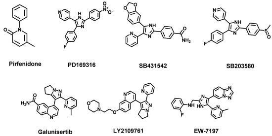 TGF-β pathway inhibition is a promising strategy for managing/treating fibrosis, inflammation and cancer. Therapeutic targets within the TGF-β pathway include integrin, TGF-βR, TGF-βR kinase, SMAD2/3 phosphorylation and TGF-β expression. The anti-integrin antibody can block integrin αvβ6 binding with LAP-TGF-β and thus prevent the release of activated TGF-β. On the other hand, the MT-1 MMP antibody can also effectively reduce the activation of TGF-β by inhibiting the function of αvβ8. The strategies to inhibit TGF-βR include ligand traps, TGF-βRI kinase inhibitor and TGF-βRII kinase inhibitors. For the TGF-β ligand trap, small molecule drugs such as pirfenidone (PFD) (Figure 6) and its derivatives were found to be ligands for the receptor. PFD has been approved by the FDA for the treatment of IPF [122,123]. In addition, PFD is also known to be a potential anti-tumor agent due to its TGF-β pathway inhibition [124]. Peptide probes, which have demonstrated selective inhibition effects for integrin and TGF-βRs, have been reported [125,126]. For kinase inhibition, selective TGF-βR kinase inhibitors such as SB431542 (Figure 6) have been shown to potently inhibit both cancer cell growth and inflammation. On the other hand, the inhibition of p38 and SMAD phosphorylation, which suppresses TGF-β upregulation, has been achieved with small molecule inhibitors PD169316 and SB203580 (Figure 6) [127].