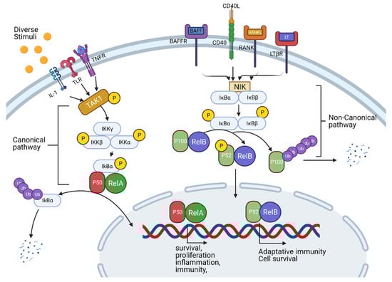 The transcription factor NF-κB is a regulator of inflammation and immune response. The NF-κB pathway is crucial to the survival of several cancer types as it prevents cell death and promotes cell proliferation by inhibiting tumor suppressors such as p53. Several pro-inflammatory ligands and their receptors (cytokine receptors, pattern-recognition receptors (PRRs), TNF receptor and T-cell receptors) activate the NF-κB pathway [38]. It has been shown that NF-κB signaling has two separate pathways. The “canonical” pathway is stimulated by TNF-α and IL-1 or TLR to cause the induction of IκBα phosphorylation by IKK (Figure 7). IκBα is a protein associated with and inactivated by p50/Rel-A or p50/c-Rel dimers. The phosphorylation of IκBα promotes its degradation by the ubiquitin–proteasome degradation pathway; the consequently released Rel-A/p50 will translocate into the nucleus and promote the expression of pro-inflammatory cytokines, anti-apoptosis proteins, chemokines and cell cycle regulators. The downstream effect of this signaling cascade is the induction of tissue inflammation, necrosis or tumorigenesis. For the non-canonical NF-κB pathway, the stimulation from LTs, CD40L, or BAFF, causes IKKα activation and the release of the p100/Rel-B dimer into the nucleus (Figure 7). Both pathways are responsible for inflammation, tissue necrosis and tumorigenesis.