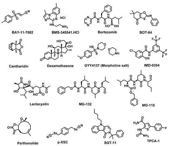 Structures of representative examples of small molecule inhibitors of the NF-κB pathway.