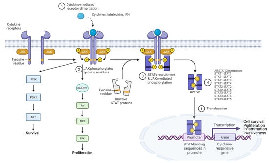 Signal transducer and activator of transcription (STAT) is an essential regulator of inflammation signal in tissue inflammation. The STAT family consists of seven sub-members: STAT1, STAT2, STAT3, STAT4, STAT5a, STAT5b and STAT6. Each member plays a different role in regulating inflammation, proliferation, survival and tumorigenic activities [148]. In general, STAT proteins are activated through the receptors-ligands (interleukins, interferon, etc) interaction that stimulates the phosphorylation of Janus kinases (JAKs). The activated JAKs phosphorylate STAT; the dimerization of the phosphorylated STAT (p-STAT) results in the translocation of the p-STAT dimer into the nucleus where it induces the transcription of STAT-target genes (Figure 9).