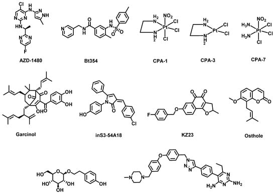 Therapeutic agents targeting the STAT3 pathway (Figure 10) have been well studied as treatment modalities for cancers. STAT3 inhibitors investigated to date include JAK kinase inhibitors, STAT3 SH2 domain phosphorylation inhibitors, nuclear translocation inhibitors, DNA binding domain inhibitors and transcription inhibitors. Representative examples of small molecule STAT3 inhibitors are JAK kinase inhibitor AZD-1480 [166]; SH2 domain inhibitors Bt354 [167], osthole [168] and KYZ3 [169]; STAT3 translocation inhibitor farcinol [170]; STAT3 DBD inhibitor methylsulfonylmethane (as the VEGF promoter inhibitor) [171], CPA-1, CPA-3 and CPA-7 [172] to prevent DNA binding; cyclin D1 promoter inhibitor inS3-54A18 [173]; MMP-2 promoter inhibitor salidroside [174]; and pyrimethamine-based STAT3 DNA domain binding (DBD) inhibitor 11d (Figure 10) [175]. However, none of the STAT3 pathway inhibitors disclosed to date have been approved by the FDA.