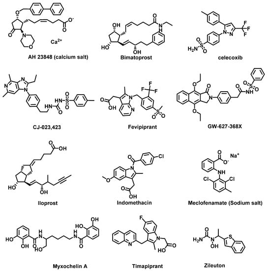The current strategy for the inhibition of the arachidonic acid metabolism pathway focuses on PG receptor inhibition, PGE2 production inhibition, COX inhibition and LOX inhibition. Specifically, PG receptor antagonists (Figure 12) have been widely used for anti-inflammation therapy. For example, timapiprant is a prostanoid receptor 2 (DP2) inhibitor which is under a clinical trial for Rhinovirus Challenge in Asthma (NCT02660489) [203]; iloprost is a PG receptor inhibitor used for treatment of pulmonary arterial hypertension (PAH) [204]; fevipiprant is a PG DP2 receptor inhibitor currently in a Phase III clinical trial (NCT02555683) for the treatment of asthma [205]; and bimatoprost, a PG analog that acts to prevent the progression of glaucoma, is in use to manage ocular hypertension [206]. The inhibition of PGE2 production by non-steroidal anti-inflammatory drugs (NSAIDs) is also effective; however, several early NSAIDs are non-selective COX inhibitors. For example, ibuprofen, indomethacin (Figure 12) and aspirin are NSAIDs with no COX-1/2 selective index [207]. A new generation of NSAIDs showing COX-2 inhibition have been developed. For example, celecoxib (Figure 12) is a selective COX-2 inhibitor [207], which is still in use as an anti-inflammatory drug for the purpose of relieving pain, swelling and rheumatoid arthritis. More recently, LOX inhibitors are attracting more attention for their potential in anti-inflammation and anti-cancer therapy. 5-LOX inhibitors include meclofenamate sodium, zileuton and myxochelins. Meclofenamate sodium effectively suppresses the production of LTD4 and attenuates asthma [208]. Zileuton also downregulates several LTs and is also used for managing asthma [209]. Myxochelins/pseudochelins are newly discovered 5-LOX inhibitors that significantly suppress LT production as well [210].