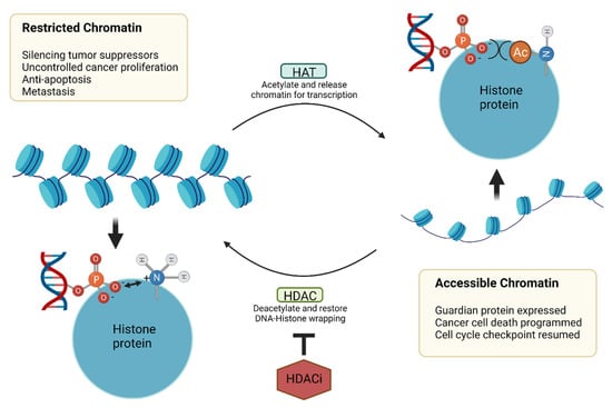 Histone acetyltransferases (HATs) and deacetylases (HDACs) are key epigenetic enzymes that regulate chromatin dynamics (Figure 13) [211]. HATs acetylate the lysine residue of histones to generate an “open” form of chromatin that is accessible to transcription factors. Nuclear HDACs promote the reverse reaction to generate restricted chromatin. HDACs also deacetylate other non-histone proteins. There are eighteen HDAC isoforms grouped into four classes [212]. Classes I, II and IV are zinc-dependent amidohydrolases, while class III comprises NAD+-dependent deacetylases. Class I consists of HDACs 1, 2, 3 and 8, which are mostly located in the nucleus; class IIa comprises of HDACs 4, 5, 7 and 9, which can shuttle between the nucleus and cytoplasm. Class IIb members are HDACs 6 and 10, which are found in cytoplasm, while the only member of class IV is HDAC 11. Class III are sirtuins, consisting of SIRT1-7.