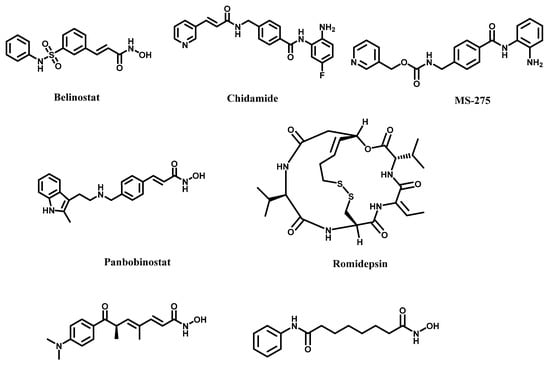 The major interest in HDAC dysregulation has been for its implications in carcinogenesis. There is solid evidence to show that HDACs play an essential role in epigenetic transformations that ultimately sustain tumor viability and invasiveness [223]. It has been found that HDACs 1 and 6 could control the invasiveness of clear cell renal cell carcinoma (ccRCC). HDAC 6 is capable of inhibiting p53 to promote tumor progression in HCC. The FDA and other non-US regulatory authorities have to date approved five HDACi (Figure 14) to treat hematological malignancies. Vorinostat (SAHA) is approved for cutaneous T-cell lymphoma [224]. Belinostat, chidamide and romidepsin have been approved for peripheral T-cell lymphoma [225,226,227], while panobinostat is approved for multiple myeloma [228]. The standard pharmacophoric model of zinc-dependent HDACi consists of a zinc-binding group (ZBG), a hydrophobic linker and a recognition cap group. Common ZBGs include carboxylic acid, hydroxamic acid, thiol, trifluoroketones and benzamide [229]. To address the pharmacokinetic and pharmacodynamic issues plaguing early ZBGs, there has been sustained interest in identifying novel ZBGs [230]. In this regard, several non-hydroxamic acid moieties, including those found in naturally occurring flavonoids (genistein, chrysin, etc.), have been reported as HDACi with novel ZBGs [231].