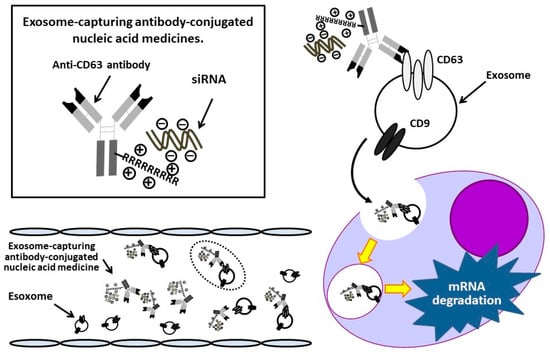 Exosomes are extracellular vesicles of diameter 50–100 nm, which contain nucleic acids, lipids, and proteins, and control intercellular communication in both healthy physiology and pathophysiology [12,13]. In recent years, treatment strategies using exosomes as a DDS have been investigated [14,15,16]. We previously demonstrated that exosomes exhibit cellular tropism and that exosomes derived from cancer cells are preferentially incorporated into their parental cells [17]. Moreover, integrins on the surface of cancer cell-derived exosomes can determine the organs to which tumors metastasize [18,19]. Based on these observations, we hypothesized that monoclonal antibody (mAb)-conjugated siRNAs that capture exosomes can efficiently deliver siRNAs into cells, and we have developed an Ab-conjugated nucleic acid medicine complex. We have found that anti-CD63 mAb-anti-miRNA oligonucleotide complexes (ExomiR-Trackers) were delivered into Cal27 human oral squamous carcinoma cells and that these Ab-oligonucleotide complexes successfully inhibited the exosomal miRNA functions [20]. In the present study, we have developed a DDS that can capture exosomes released from MM cells using a mAb against a molecule on the exosome surface to target hematologic cancers (Figure 1). We demonstrate that these exosome-capturing anti-CD63 mAb-conjugated siRNA complexes can be successfully introduced into MM cells, where they suppress targeted mRNAs.