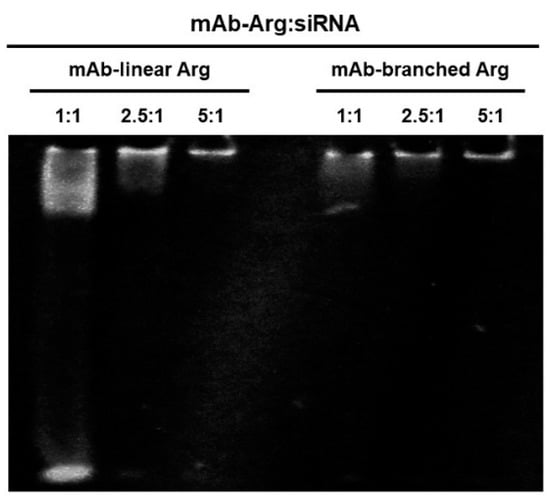 Gel shift assay. Anti-CD63 mAb-linear or -branched Arg:siRNA complexes were obtained by mixing anti-CD63 mAb bound to linear- or branched Arg linker and siRNA at various molar ratios. The lower band of the lane of mAb-linear Arg at the ratio of 1:1 indicates unbound siRNAs. (Figure S3).
