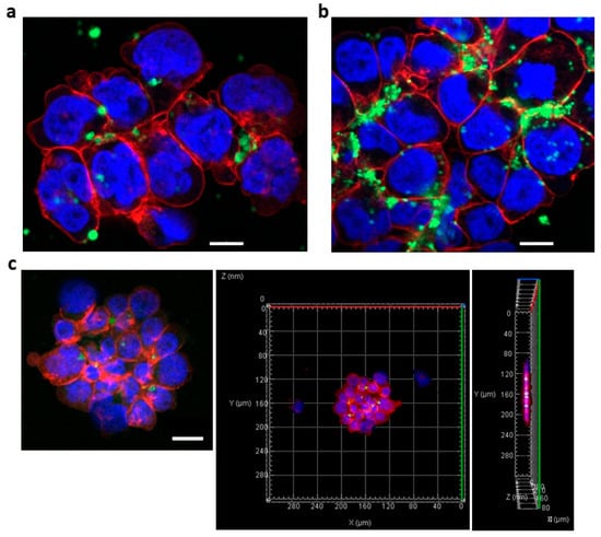 We investigated the incorporation of Ab-conjugated siRNA complexes into MM cells by examination using an LSM. First, we determined whether ADCs could transfer into adherent HeLa cells. Anti-CD63 mAb-linear Arg conjugated siRNAs was treated at a mAb-to-siRNA ratio of 5:1 (1500:300 (nM)). Confocal images showed that anti-CD63 Ab-linear Arg (9mer) conjugated with siRNAs was successfully transferred into HeLa cells (Figure 4a), and 3D images from taking Z-stack also clearly showed that these ADCs were incorporated into HeLa cells (Figure 4b,c).