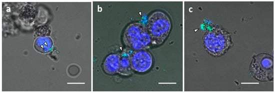 Inhibition of exosome uptake by endocytosis inhibitors. OPM-2-luc+ cells were treated with anti-CD63 Ab-conjugated FITC-labeled siRNA bound to branched Arg linkers. The anti-CD63 Ab-Arg linker:siRNA ratio was 2.5:1 (750:300(nM)). (a) Vehicle treatment. (b) Latrunculin treatment (2 μM). (c) Rottlerin treatment (2 μM). Arrowheads indicate anti-CD63 Ab-conjugated FITC-labeled siRNA complexes. Scale bar, 10 μM. Blue, Hoechst 33342 (nuclei); green, FITC-labeled siRNAs.