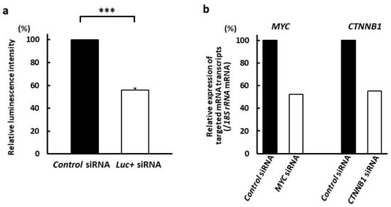Successful suppression of targeted molecules in MM cells by anti-CD63 mAb-conjugated siRNA complexes. (a) Luminescence activity was significantly decreased in OPM-2 MM cells treated with luc+ siRNAs compared with in cells treated with control siRNAs (*** p < 0.005). The anti-CD63 mAb-Arg linker:siRNA ratio was 1:1 (1500 nM). Data are presented as mean ± standard error of two independent experiments (four wells per experiment). (b) The targeted mRNA transcripts decreased in OPM-2 MM cells treated with MYC or CTNNB1 siRNAs compared with those in cells treated with control siRNA. The anti-CD63 mAb-Arg linker:siRNA ratio was 1:1 (1500 nM). Data show the representative of two independent experiments.