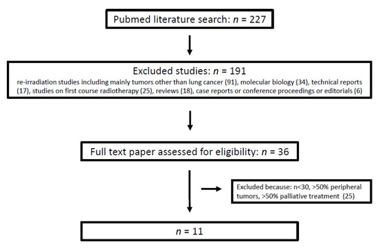 The literature search using the above-mentioned search terms retrieved 227 studies. After excluding 191 studies for the reasons described in Figure 1, 36 papers were assessed for eligibility. After full-text review, 25 studies were excluded for one or more of the following reasons: (a) the number of included patients was less than 30, (b) more than 50% of the patients had peripheral tumors, and (c) more than 50% of the patients received palliative treatment. Finally, 11 studies were included in the analysis (Figure 1). The selected studies were published between 2012 and 2021 (Table 1 and Table 2), 1 of which was prospectively designed [3]. The median number of patients per study was 46 (range: 30–102) adding up to 524 who were included in this analysis. The median proportion of centrally located tumors was 74% (range: 52–100%). Most of the patients 514/524 (98%) finished the re-irradiaton course as scheduled. As for histology, the minimum proportion of NSCLC patients was 72% [25]. Although in 9 studies at least 66% of the patients had a performance score of 0–1, this was not specified in one study [26] and another summarized all patients with ECOG 0–2 [3]. All included studies listed the disease stages in detail-either at RT or at Re-RT. Locally advanced lung cancer, i.e., UICC IIb to IIIc, was present in more than 50% of the patients. Schlampp’s study represented a borderline case that was included because the cohort consisted of 62 patients with initial stage III tumors who received an average EQD2 of 99.5 Gy in both RT courses [27].