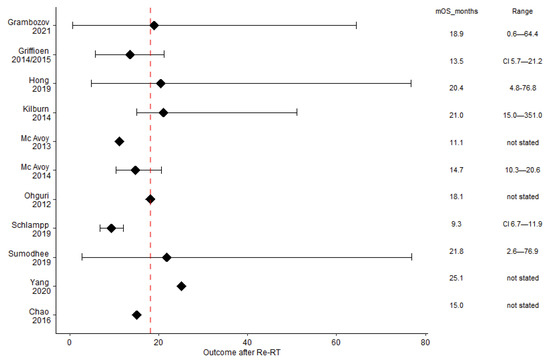 The mOS was 18.1 months (range 9.3–25.1), with five studies above this median (Figure 2) and large ranges reaching up to 76.9 months [28]. The mPFS was 9 months (range: 4.5 [29]–16 [25]) and the mLRC was 12.1 months (range: 6.5 [27]–20 [30]). The median proportion of long-term survivors after re-irradiation was 39% (range: 15% [27]–50% [26]). Outcome data are summarised in Table 3.