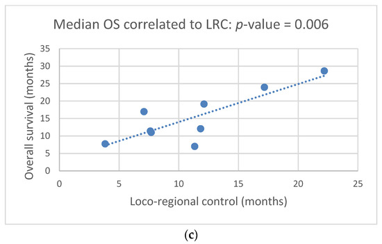 (a). Total dose at re-irradiation correlates to median loco-regional control (mLRC) (Pearson correlation, p-value = 0.012). (b). Total dose at re-irradiation correlates to median overall survival (Pearson correlation, p-value = 0.007). (c). Median OS correlates with median loco-regional control (Pearson correlation, p-value = 0.006).