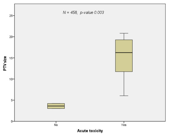 The majority of patients were treated with advanced technologies for re-irradiation such as IMRT, SABR, and protons (Table 2). Only Ohguri and co-workers used 3D conventional radiation technique [23]. The median re-irradiation PTV and dose were 96 mL (range: 13–248 mL) and 55 Gy (40–67 Gy), respectively. The median cumulative EQD2 was 124 Gy (range: 100–209 Gy) excluding the prospective study by Chao, in whose cohort summary treatment plans could not be calculated due to a lack of data on the first treatment course, as the patients were treated in external centers [3]. The median total dose at re-RT was 56 Gy (range: 50 to 64 Gy). Since this parameter was reported in all studies, the correlations between dose and clinical endpoints were calculated with this variable. The total dose at re-RT correlated with both LRC (Figure 3a, p-value = 0.012) and OS (Figure 3b, p-value = 0.007) with a close relation between these two clinical endpoints (Figure 3c, p-value = 0.006). The occurrence of acute toxicity grade 1 to 4 was dependent on the PTV size at re-irradiation (Figure 4, p-value = 0.033). In two studies [23,25] the re-irradiation PTV was not given three-dimensionally; therefore, these two studies were excluded from this correlation calculation. Reports on doses to the OARs were inconsistent. One study [24] explicitly mentioned constraints, whereas another [27] listed the actual doses administered to the OARs. With regard to the four main OARs (esophagus, lung, heart, spinal cord), which limit doses in thoracic irradiation, the following information could be extracted from the eleven papers included in the analysis. (1) For the esophagus cumulative Dmax, V60 and MED ([11,23,27] were considered with a limit set at a cumulative Dmax of 100 Gy [24] and a reported Dmax of 92.5 Gy [27]. (2) For the lungs, the following parameters were used for limiting pulmonary toxicity: V5, V10, V20, MLD [11,23,24,27]. In Grambozov’s study, the V20total lung was set at 50% [24]. Furthermore, a V20total lung of 31 Gy, MLD of 18.6 Gy and V5 of 80.3% was reported in a study by Schlampp [27]. Regarding cardiac toxicity, V40 and Dmax were used as dose parameters in McAvoy’s study. Moreover, in one study, a MHD of 7.9 Gy was reported [27], and in another a constraint of V20 < 20% [24] was used. The cumulative dose limit for the spinal cord dose was Dmax 75 Gy [24].