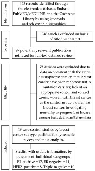 This systematic review with meta-analysis was designed according to PRISMA (Preferred Reporting Items for Systematic Reviews and Meta-Analyses) guidelines [36,37] to determine if use of oral contraception, as compared to placebo, affects the risk of the breast cancer subtypes (Supplementary File S1—PRISMA 2020 Checklist). The bibliographic databases MEDLINE (PubMed), Embase and the Cochrane Library were searched for the identification of case-control studies that were conducted up to June 2020. The following search terms were used for all databases in various combinations: “oral contraceptives” or “birth control pill” AND “subtype breast cancer risk” or “ER+ subtype” or “ER− subtype” or “HER2 positive” or “TNBrCa”. References of found articles, previous review articles and meta-analysis, and other relevant publications related to the topic of the work were also searched in order to identify further pertinent studies. Articles were initially evaluated according to title and/or abstract. Next, the decision was made to include or exclude after independent and double analysis, and full tests of selected studies. Relevant research data was extracted from the full-text works selected for inclusion.