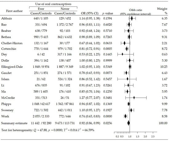 Seventeen trials [46,47,48,49,50,51,52,53,54,55,56,57,58,59,60,61,62,63] contributed to the meta-analysis on the effects of oral contraceptives use on the acquisition risk of ER-positive breast cancer (ER+BrCa). Here, the data were pooled from studies comprising a total of 227,126 women, including 21,115 and 206,126 participants in the intervention and control arms, respectively. These studies included four that reported a non-significant increase in the risk of ER+BrCa [46,47,52,61]; in the remaining studies, a risk reduction was noted, including three wherein the changes were statistically significant [51,55,59]. The summary meta-analysis showed that ever-use of OC significantly decreased ER+BrCa risk, compared with never-use: OR = O.92, 95% CI: 0.86 to 0.99, p = 0.026, I2 = 66.59% (Figure 2). No significant publication bias was found after Begg’s (p = 0.529) and Egger’s (p = 0.384) test assessments (Table 2).