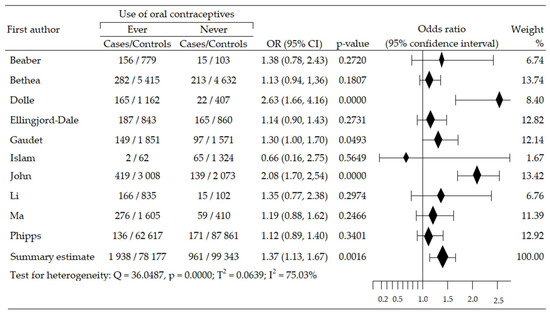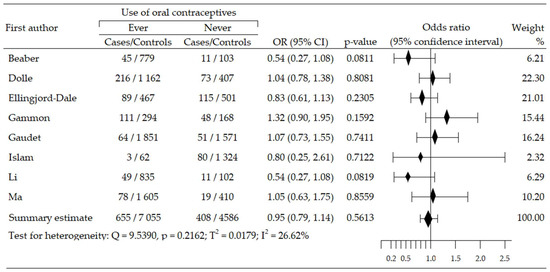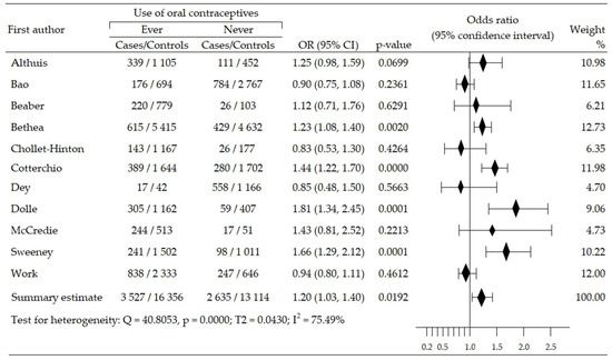 In the previous article, we compiled, also using meta-analyzes, data from 79 case-control studies from 1960–2010. According to the results of the statistical analysis, there was an increased risk of BrCa with the use of OC before the first full-term pregnancy (OR = 1.14, 95% CI: 1.01 to 1.28, p = 0.036); as well as with the use of OC for more than five years (OR = 1.09, 95% CI: 1.01 to 1.18, p = 0.020). On the other hand, the use of OC before the age of 25 reduced the risk of BrCa: OR = 0.91, 95% CI: 0.83 to 1.00, p = 0.052 [34]. Our second meta-analysis included 42 studies published between 2009 and 2020. It turned out that the use of OC statistically significantly increased the risk of BrCa: OR = 1.15, 95% CI: 1.01 to 1.31, p = 0.036 [35].