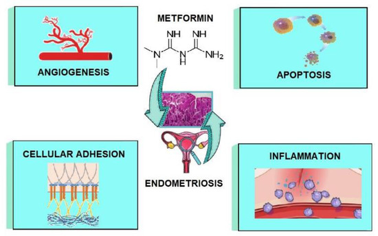 Therefore, there is an urgent need to explore safe and cheap medicaments, which have been used for many years in other diseases, in treating endometriosis. The purpose of this article is to introduce the current knowledge on the possibilities of using metformin in the pharmacological treatment of endometriosis. Additionally, this review aims to recapitulate the potential actions of metformin in endometriosis by acting on angiogenesis, apoptosis, cellular adhesion, and inflammation (Figure 1).