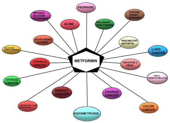 The therapeutic potential of this medicament, which is most likely induced by the improvement in insulin sensitivity, is employed in different conditions, including cardiovascular diseases, diabetic nephropathy, polycystic ovary syndrome (PCOS), and the prevention or treatment of cancer [59,72,73] (Figure 2). Hyperinsulinemia caused by insulin resistance might, in fact, induce carcinogenesis indirectly by raising the levels of steroid sex hormones and directly through the insulin receptor or insulin-like growth factors (IGF), inflammatory processes, and interrupting adipokines homeostasis [74].