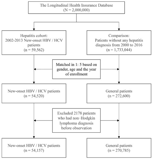 The study design was a retrospective cohort study to examine the risk of NHL in patients with HBV or HCV. The date of diagnosis of chronic hepatitis was defined as the observation start date for participants in the study group, and after matching, the same date was assigned as the observation start date for corresponding members of the control group. All participants were tracked from the observation start date until death, or the participant being diagnosed with NHL, or the end date of the study. The definition of NHL in the study was based on ICD-9-CM diagnostic code 202.8 and ICD-10-CM diagnostic codes C85.8 and C85.9. The control variables in this study were the patient’s sex, age, and related comorbid conditions. The comorbid conditions included diabetes mellitus (ICD-9-CM: 250), hypertension (ICD-9-CM: 401–405), dyslipidemia (ICD-9-CM: 272), kidney disease (ICD-9-CM: 580–588), rheumatoid arthritis (RA) (ICD-9-CM: 714), lupus erythematosus (LSE))(ICD-9-CM: 710), psoriasis (ICD-9-CM: 696), human immunodeficiency virus (HIV) (ICD-9-CM: 042–044), and organ transplant (NHI surgery order codes: 68035, 68037, 68047, 75020, 76020, 75418, 85213).