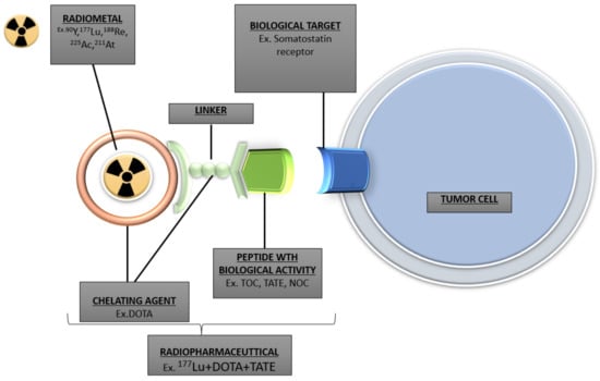 The radiopharmaceuticals used in this therapy have a triple structure. The principal structure is the radiometal that emits the radiation, the second is a biological vector consisting of a peptide that binds to a well-defined target (SSTR), and the third is a bifunctional chelating agent that binds the radiometal in a stable manner and allows its conjugation. A linker is usually inserted between the chelating agent and the biological vector to limit the influence of the chelating moiety. The emission of β− and α radiation by the radiometal is what allows the destruction of the NENs tumoral cells by breaking DNA strands. Analogues of the peptides with biological activity are obtained from modifications in the sequence of amino acids. For example, replacing Phe3 in the octreotide by Tyr3 (TOC) improves affinity for SSTRs (in particular SSTR2), and the introduction of a Thr (TATE) instead of Thr (ol) (TOC) further increases this affinity [9] (Figure 1).