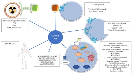 The use of alpha-emitting radionuclides in PRRT could potentially increase the level of tumoral cell death by increasing the number of DNA double-strand breaks [70]. These radionuclides include 213Bismuth (213Bi), 225Actinium (225Ac), and 212Lead (212Pb). The literature with these radionuclides is scarce, and there is a need for good clinical trials regarding the dose-limited toxicity and efficacy.