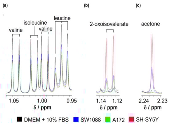 Representative spectra of branched-chain amino acids (leucine, isoleucine, and valine); (a), 2-oxoisovalerate (b) and acetone (c) of culture media consisting of DMEM supplemented with 10% FBS before (black) or after incubation of glioma (blue), glioblastoma (green), and neuroblastoma (red) cells for 24 h obtained by 1H-NMR spectroscopy. The ranges of chemical shifts (δ) with peaks for all three BCAAs (a); 2- oxoisovalerate (b) and acetone (c) are depicted.