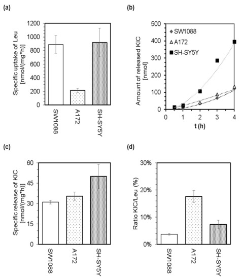 The capability of cultured glioma (SW1088), glioblastoma (A172), and neuroblastoma (SH-SY5Y) cells to withdraw leucine from culture media (minimal medium supplemented with 25 mM glucose and 0.8 mM leucine-13C6) and to release KIC. LC-MS analysis of the culture media allowed estimation of specific uptake of Leu (a), the time dependence of KIC release (b), the specific release of KIC (c), and calculation of the ratio of released KIC to withdrawn Leu (d).