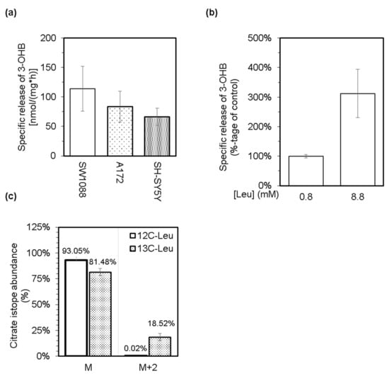 Levels of 3-hydroxybutyrate (3-OHB) in culture media from glioma (SW1088), glioblastoma (A172), and neuroblastoma (SH-SY5Y) cells were enzymatically estimated, and subsequently, the obtained values were used to calculate the specific release of 3-OHB (a). The effect of an increased level of leucine in culture medium (up to 8.8 mM) of neuroblastoma (SH-SY5Y) cells on their capacity to release 3-OHB (b). LC-MS was used to estimate the abundance of citrate isotopes released into the culture media from glioma cells (SW1088), which were incubated in a minimal medium supplemented with 25 mM glucose and either 0.8 mM leucine (12C-Leu) or 0.8 mM leucine-13C6 (13C-Leu; (c)). Group M represents the normal molar mass of citrate (191,124 g/mol), and group M + 2 represents the molar mass of citrate increased by two units (193,124 g/mol).