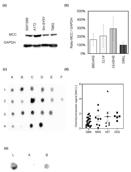 The extracted proteins from brain cancer samples were used to detect MCC expression by the dot blot method. The nitrocellulose membrane was spotted with 2 µg of tumor lysate protein. The membrane was incubated in BS1 at RT for 30 min to block the free binding sites on the membrane. Subsequently, the membrane was incubated with the mixture of rabbit antiserum against MCC diluted 1:250 in BS1 at 4 °C overnight. Afterwards, the membrane was washed three times with TBS-T. Subsequently, the membrane was probed with the solution of anti-rabbit IgG molecules conjugated with horseradish peroxidase (1:10,000) in BS1 for 2 h. The membrane was rinsed 3× in TBS-T for 10 min and 1× in TBS, and subsequently, the membrane was soaked in SuperSignal West Pico Chemiluminescent Substrate solution (Thermo Fisher Scientific). The chemiluminescent signal was recorded by the Chemidoc XRS system (BioRad Laboratories, Bratislava, Slovakia). The obtained chemiluminescent signals for MCC were quantified with the Image Studio Lite version 5.2 software (LI-COR Biotechnology).