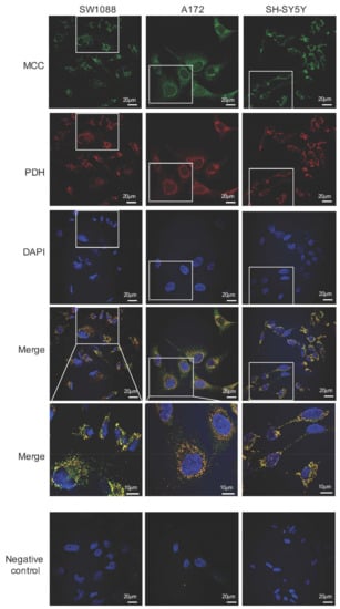 In combination with Alexa Fluor 488-conjugated secondary antibodies, polyclonal rabbit anti-MCC were also used for immunofluorescence detection of MCC expression in human neural cancer cell lines. Among all tested types of cells, namely glioma SW1088, glioblastoma A172, and neuroblastoma SH-SY5Y, a green fluorescence signal was visible when observed by fluorescence microscopy that was localized in the intracellular space with highest signal concentration near the cell nuclei (Figure 5). Indeed, polyclonal human anti-PDH combined with TRITC-conjugated secondary antibodies (red fluorescence signal) were used for immunofluorescence detection of a mitochondrial specific enzymatic complex of PDH (Figure 5). The colocalization of PDH (mitochondrial marker) with MCC in the same subcellular compartment could be confirmed by appearance of yellow color in merged views. Although the observed fluorescence signal was visible only when a combination of primary and secondary antibodies were used (Figure 5) and absent from samples where only secondary antibodies were applied (Figure 5), it can be assumed that the observed fluorescence signal corresponds with the presence of MCC in the cells.